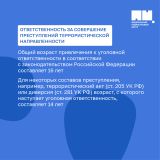 Статья «Террористический акт» предусматривает совершение взрыва, поджога или иных действий, устрашающих население и создающих опасность гибели человека, причинения значительного имущественного ущерба либо наступления иных тяжких последствий в целях дестабилизации деятельности органов власти или международных организаций, либо воздействия на принятие ими решений, а также угроза совершения указанных действий в целях воздействия на принятие решений органами власти или международными организациями. Ответственность за теракт наступает с 14 лет и наказание составляет от 12 до 20 лет.