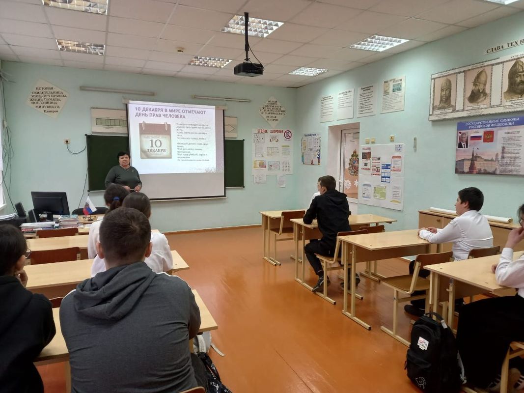 День прав человека ежегодно отмечается 10 декабря. На встрече с уполномоченным по правам ребёнка Косаевой Л. А. ребята получили представление об основных правах , свободах и обязанностях человека и гражданина РФ. Час общения прошел в формате дискуссии. Ребята задавали вопросы, высказывая собственное мнение относительно актуальных проблем в области прав человека.